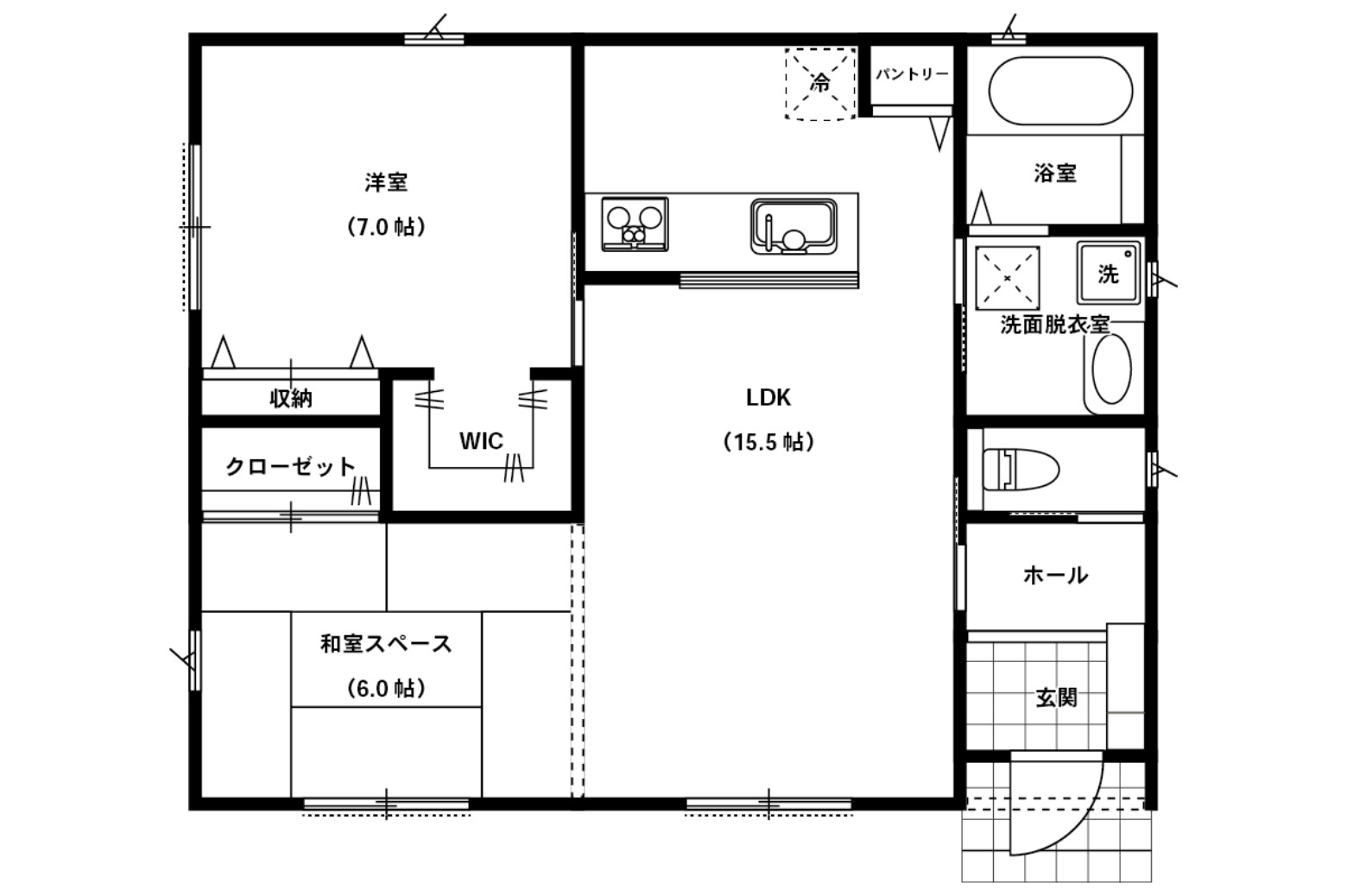 本プランはあえて扉や間仕切りを設けず、スペースとしてご提案。ライフスタイルやお好みに合わせて2LDKに変更いただくことも可能です。